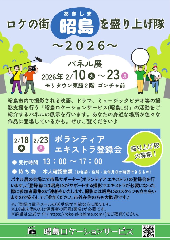 ボランティアエキストラの詳細については昭島ロケーションサービス エキストラ募集をご覧ください。